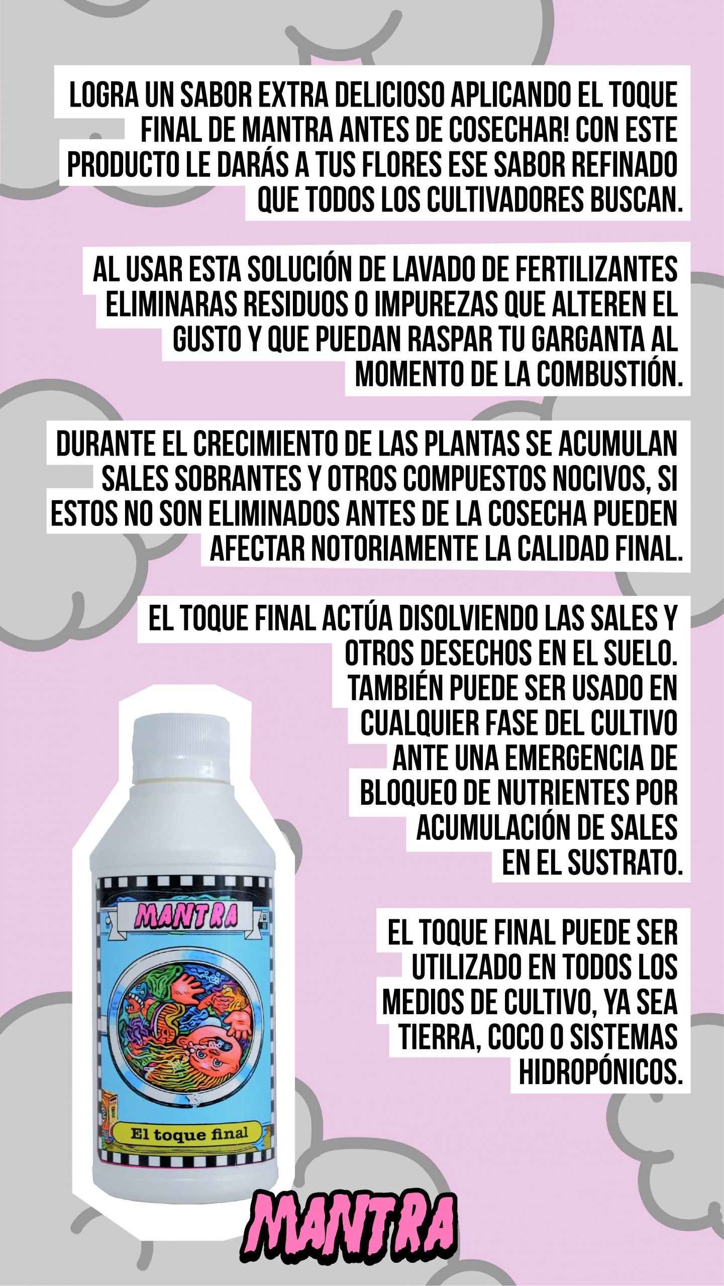 Logra un sabor extra delicioso aplicando El Toque Final de Mantra antes de cosechar! Con este producto le darás a tus flores ese sabor refinado que todos los cultivadores buscan.