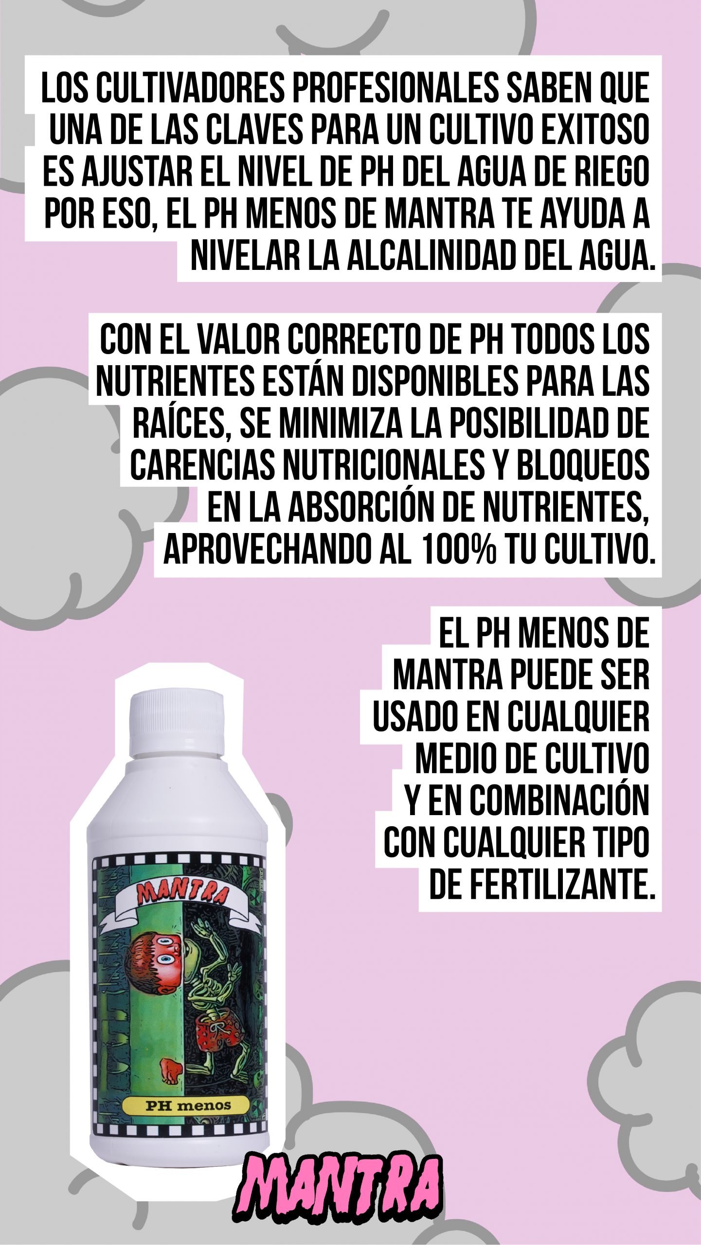 Los cultivadores profesionales saben que una de las claves para un cultivo exitoso es ajustar el nivel de ph del agua de riego por eso, el PH menos de Mantra te ayuda a nivelar la alcalinidad del agua.
